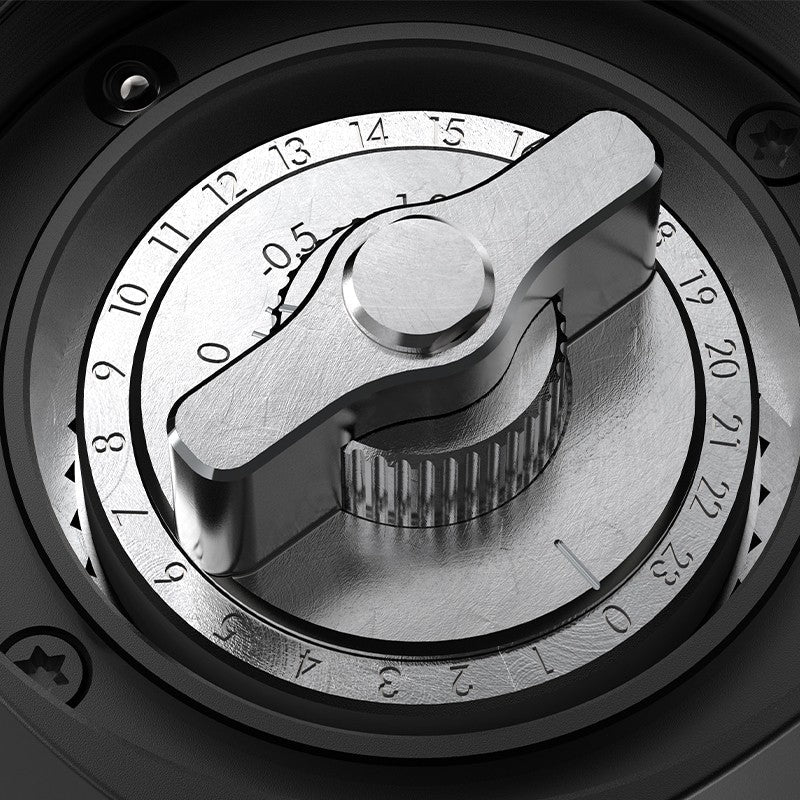 The Handle, unlike any other grinder handle, needs an entire section to itself. It’s hard to convey just how unique it is without picking it up in person, but we'll try. First appearing on the Timemore Nano grinder, the foldable handle is game-changing, but a simple piece of engineering. When not in use, the handle folds down to the side of the grinder and stays nicely tucked away. The back of the knob also has a rubber damper that both prevents the body from being damaged, and doubles as a knock tool to ensure that any residual grinds can be cleared from the chamber. When you straighten the handle out, it locks into place and is a pleasure to grind with but, in all honesty, the soothing sound of opening and clicking into place would make us buy this grinder on its own.