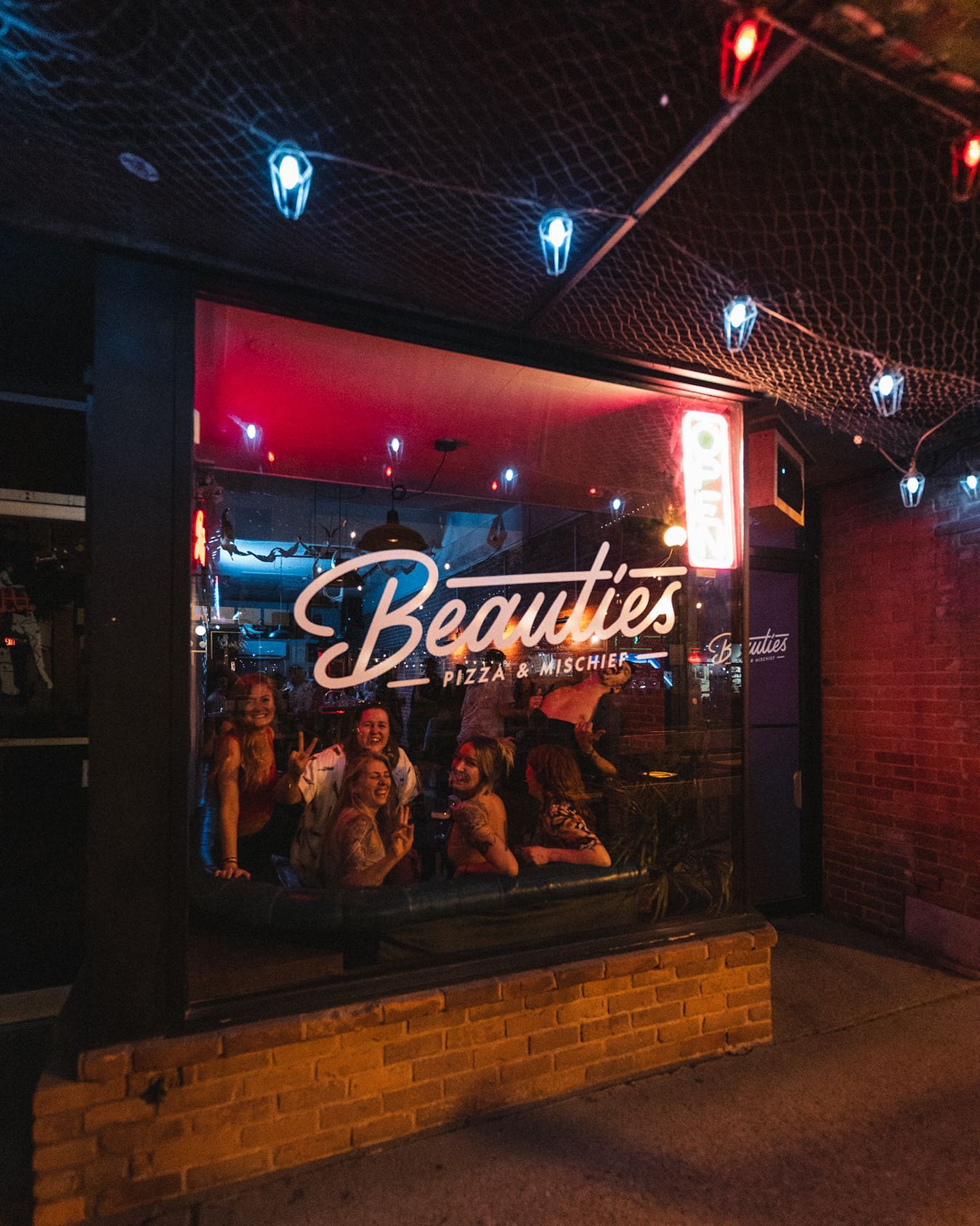 Beauties serves pizza and mischief from morning til late, specializing in draft beer, craft cocktails, and stone-baked NY-style pizza.