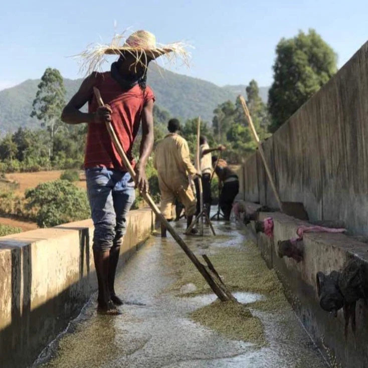 Freshly picked cherries are delivered to the Gigesa washing station and immediately put into a “floatation tank” to separate lower quality cherries. The coffee is then left under shade for 3-5 hours to let the surface water dry off before ultimately being spread out on raised drying beds. The cherries are observed and agitated to ensure even drying and avoiding over-fermentation. The natural drying process at the Gigesa washing station typically lasts 15 to 18 days.